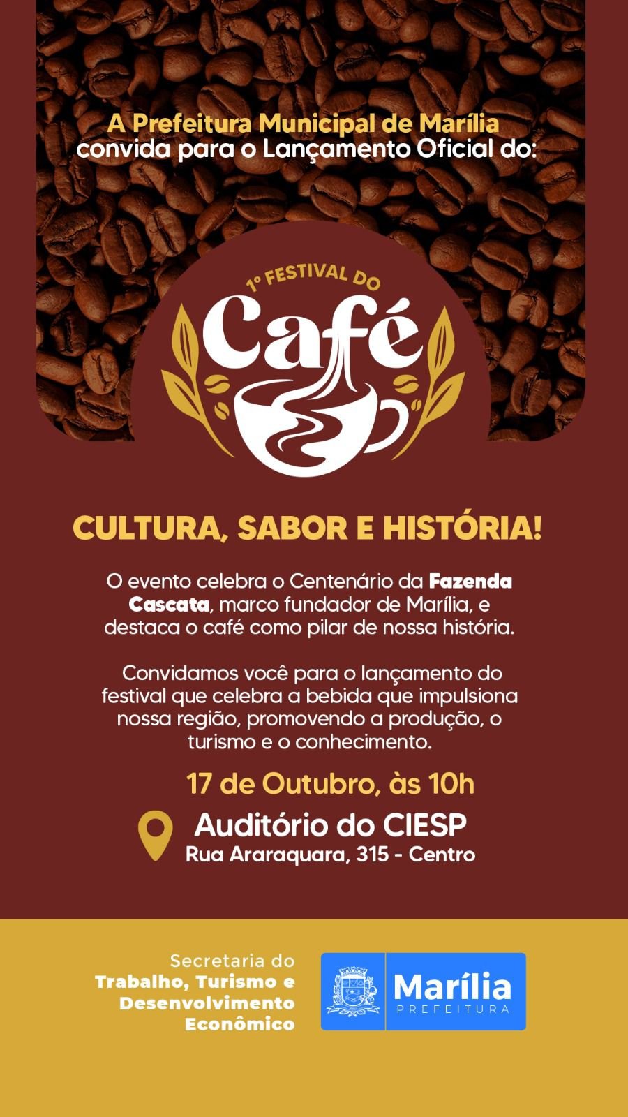 O evento celebra o centenário da Fazenda Cascata, propriedade que teve papel fundamental na fundação e no desenvolvimento de Marília, e marca também a inserção de Marília e região no programa estadual Rotas do Café, valorizando uma das mais importantes cadeias produtivas responsáveis pelo crescimento econômico e cultural local e regional.