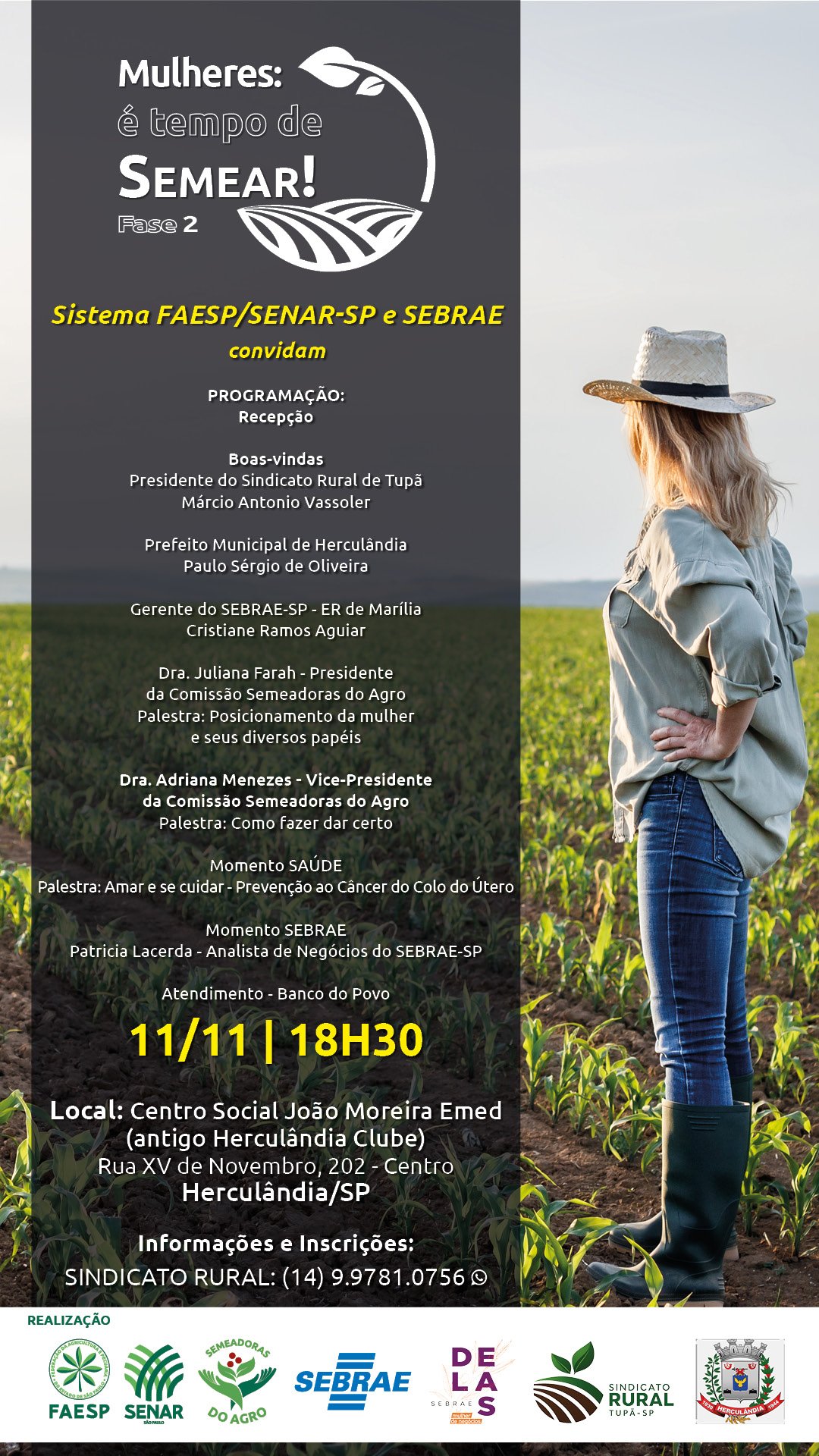 A Federação da Agricultura e Pecuária do Estado de São Paulo (Faesp), em parceria com o Sebrae-SP, tem o prazer de anunciar a chegada do projeto “Mulheres: É Tempo de Semear!” a Herculândia. O evento ocorrerá nesta terça (11/11), às 18h30, no Centro Social João Moreira Emed (antigo Herculândia Clube), rua XV de Novembro, 202, Centro.