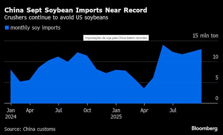 As importações de soja da China atingiram um recorde para o mês de setembro, enquanto o país evitou suprimentos dos EUA em meio ao ressurgimento das tensões comerciais entre as potências agrícolas. O maior comprador mundial importou 12,9 milhões de toneladas de soja em setembro, o maior valor já registrado para aquele mês, segundo dados da alfândega do país.