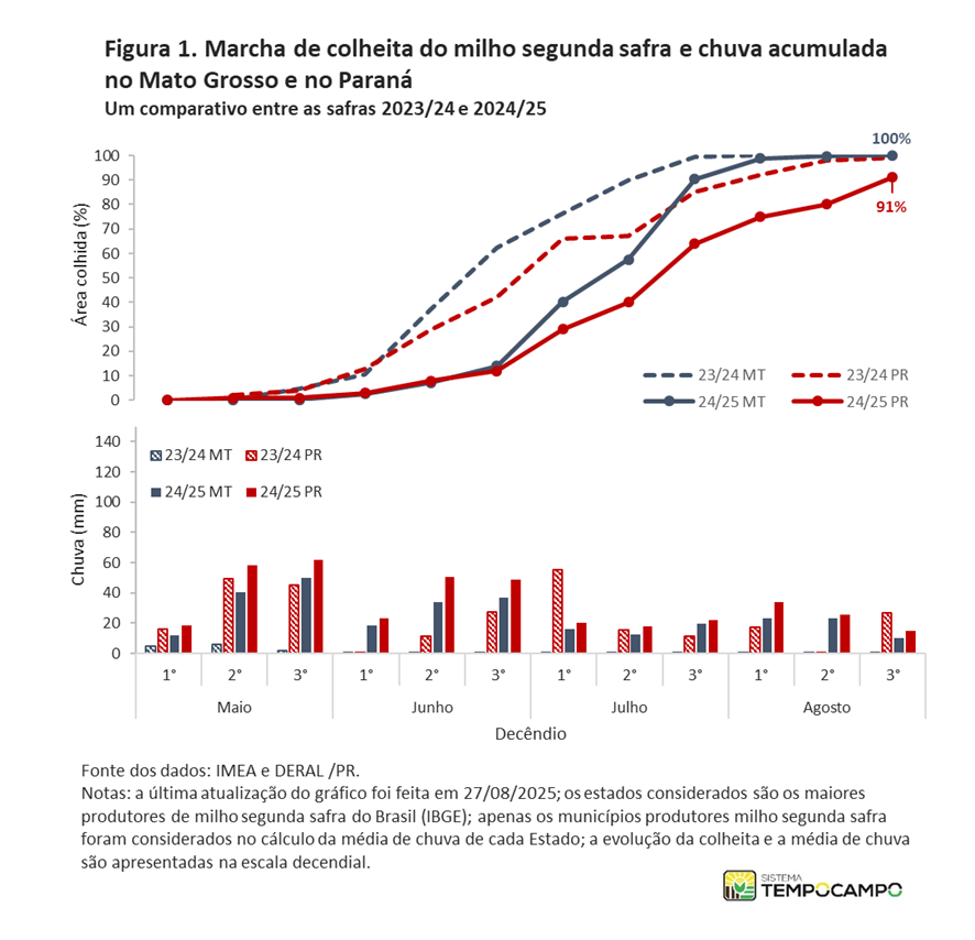 O Mato Grosso se mantém como principal produtor da segunda safra, responsável por aproximadamente 49% da produção nacional, o estado mantém a perspectiva de safra recorde, de acordo com dados do Instituto Mato-grossense de Economia Agropecuária (IMEA/MT). Durante agosto, a colheita ganhou maior velocidade, reduzindo parte do atraso observado no início do processo em comparação com o mesmo período do ano anterior. O atraso esteve associado à ocorrência de chuvas persistentes e temperaturas mais baixas, que dificultaram a secagem natural dos grãos no campo, impondo maiores desafios logísticos e operacionais à colheita e ao armazenamento.