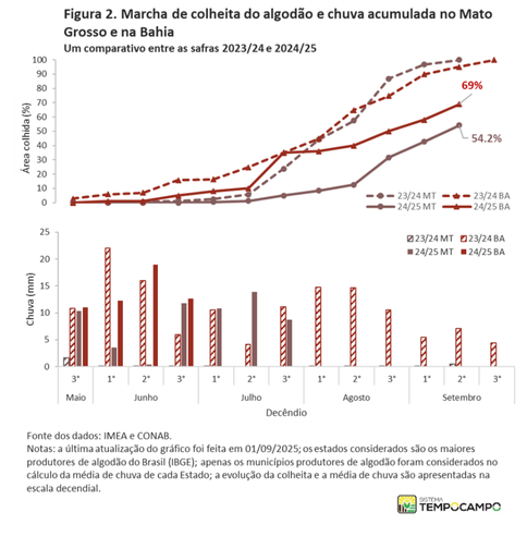 No Mato Grosso, as temperaturas elevadas têm acelerado o ritmo da colheita. O manejo concentrou-se no controle de pragas, com ênfase no bicudo-do-algodoeiro, além da roçagem e da dessecação de soqueiras. Segundo o IMEA/MT, a área cultivada no estado registrou incremento de 4,18 pontos percentuais em relação ao ciclo passado. Apesar do atraso na colheita em comparação a anos anteriores, a projeção de produtividade permanece positiva, resultado atribuído aos efeitos benéficos das chuvas tardias sobre as lavouras de segunda safra.